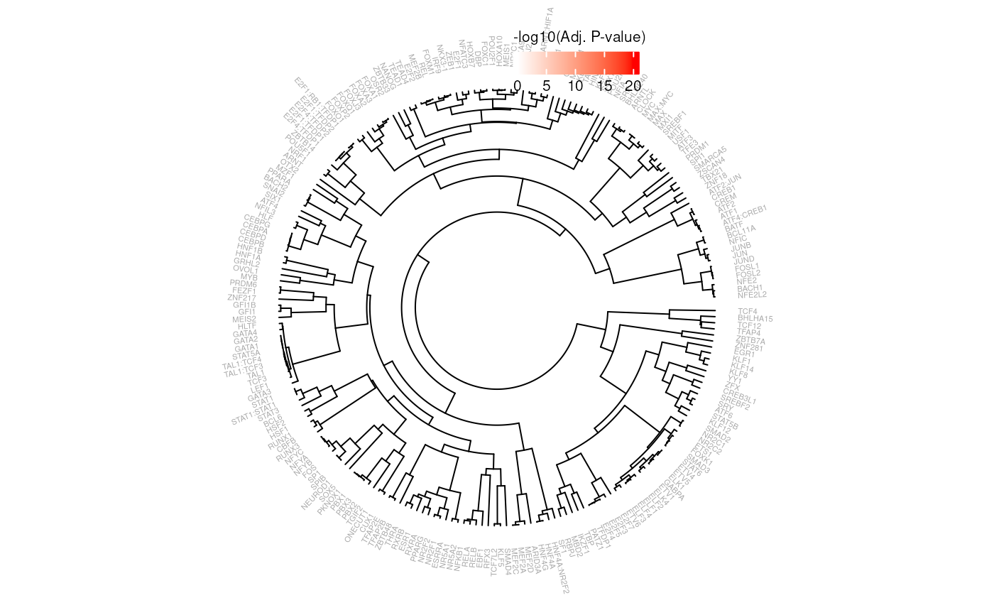 Generates a circular dendrogram, clustering SNP Effect Matrices on similarity and a heatmap representing the -log10 transformed adjusted p-value of a SEMPLR enrichment.